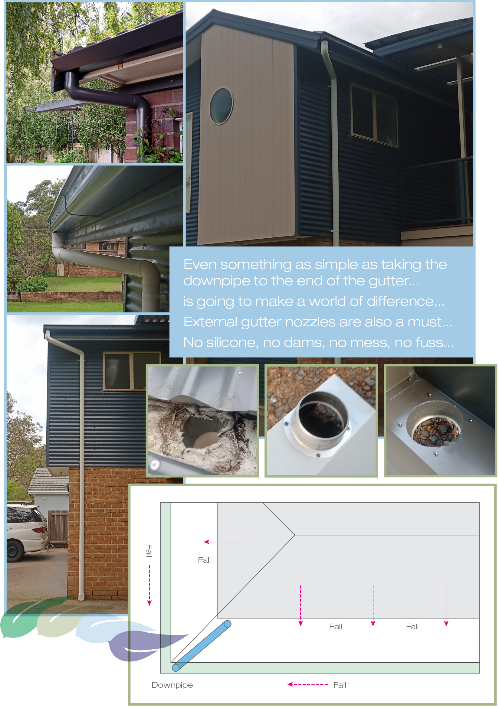 Just like your roof, your gutters also need pitch/fall to your downpipes.